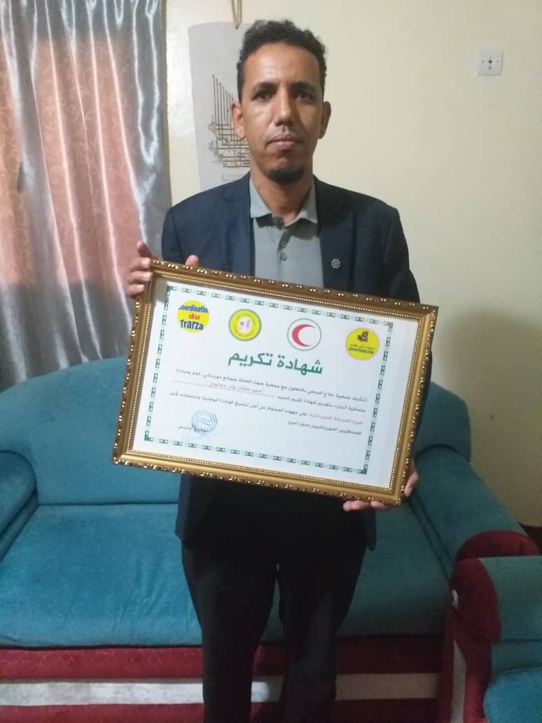 قدمت جمعيات، "صوت الضفة" و"علاج المرضى" و"مبادرة منسقية اترارزه" وموقع "موريتاني كوم" ،صباح اليوم الاثنين بمقرنقابة الصحفيين الموريتانيين في نواكشوط، تكريما لنقيب الصحفيين الموريتانيين السيد أحمد طالب ولد المعلوم، تثمينا لمايبذله من جهود لصالح الصحفيين عموما وأسر الراحلين منهم خصوصا ولدوره الكبير في ترسيخ معاني الوحدة الوطنية وقيم المهنة الصحفية .