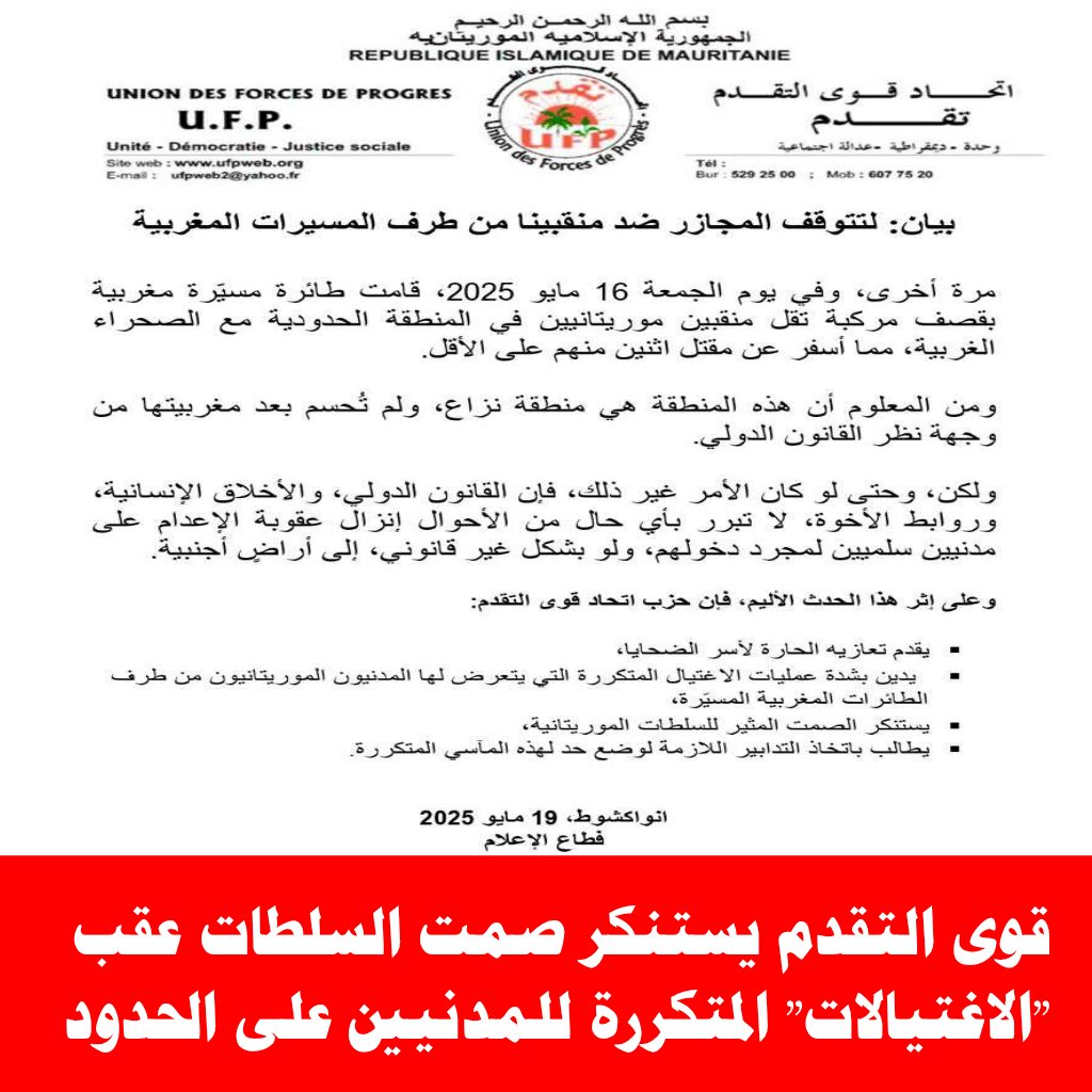 استنكر حزب اتحاد قوى التقدم الصمت المثير للسلطات الموريتانية، عقب الاغتيالات المتكررة التي يتعرض لها المدنيون الموريتانيون من طرف الطائرات المغربية المسيرة على الحدود.