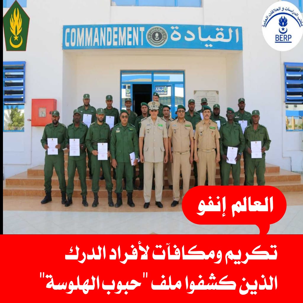 سلّم قائد أركان الدرك الوطني اللواء أحمد محمود ولد الطائع، اليوم الجمعة شهادات تهنئة مكتوبة، ومكافآت لأفراد الدرك الوطني الذين شاركوا في تنفيذ المداهمات الأمنية والعمليات النوعية الأخيرة، والتي كشفت الشبكة المشمولة في الملف المعروف بملف "حبوب الهلوسة".