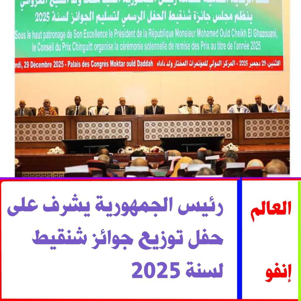 أشرف رئيس الجمهورية، السيد محمد ولد الشيخ الغزواني، اليوم الاثنين، بالمركز الدولي للمؤتمرات “المختار ولد داداه” في نواكشوط، على حفل توزيع جوائز شنقيط لسنة 2025.